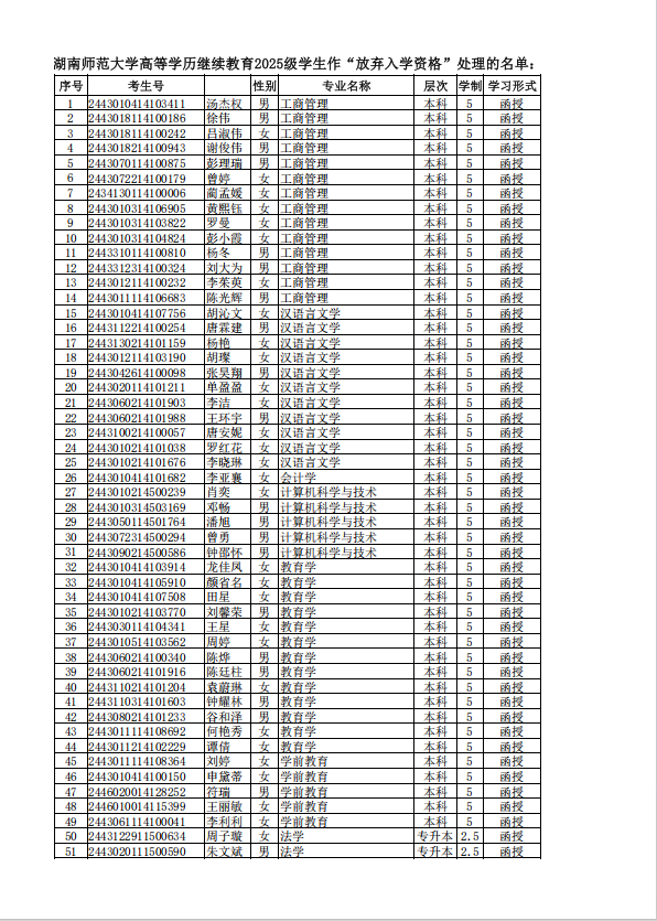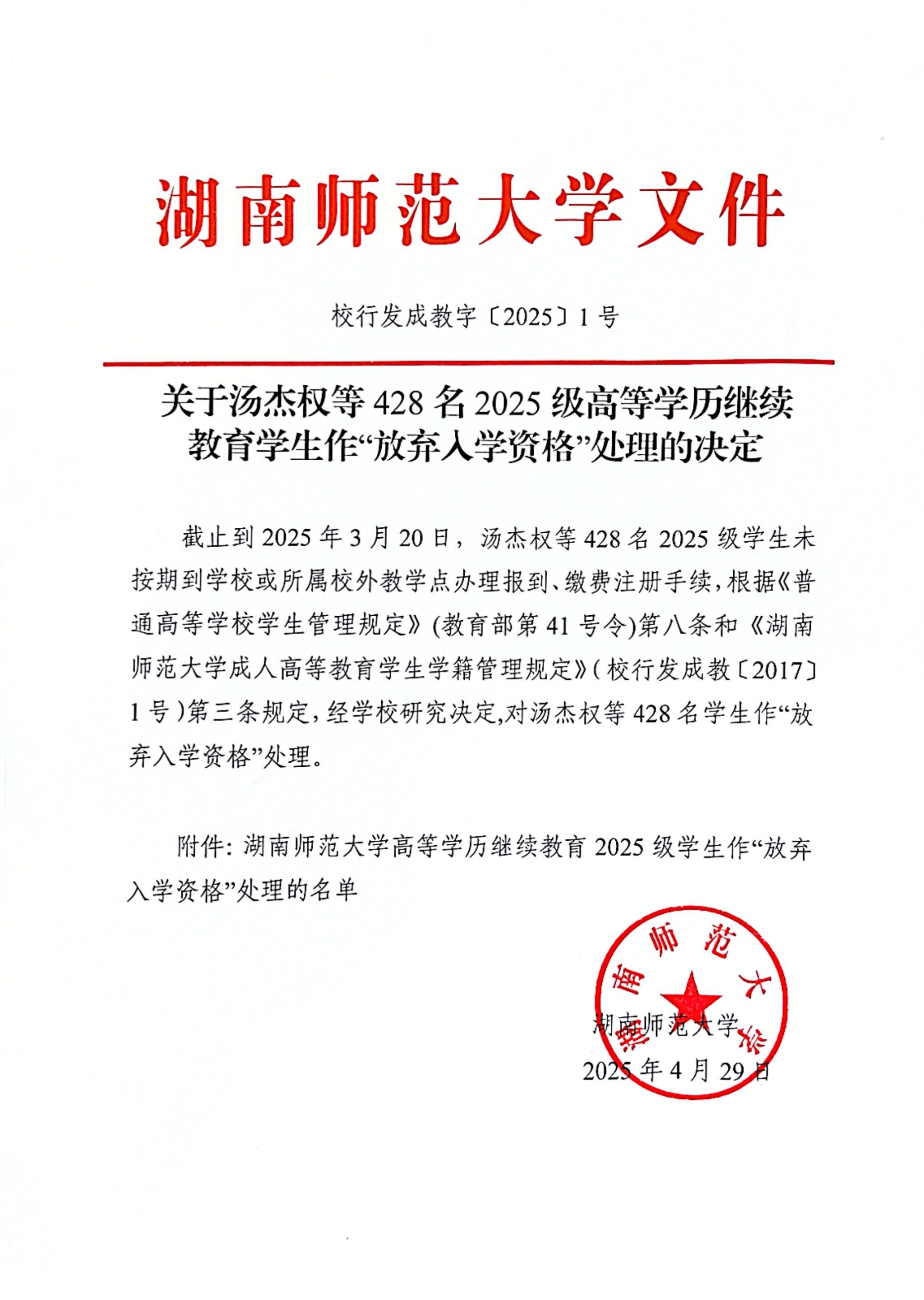 关于汤杰权等428名2025级高等学历继续教育员工作“放弃入学资格”处理的决定